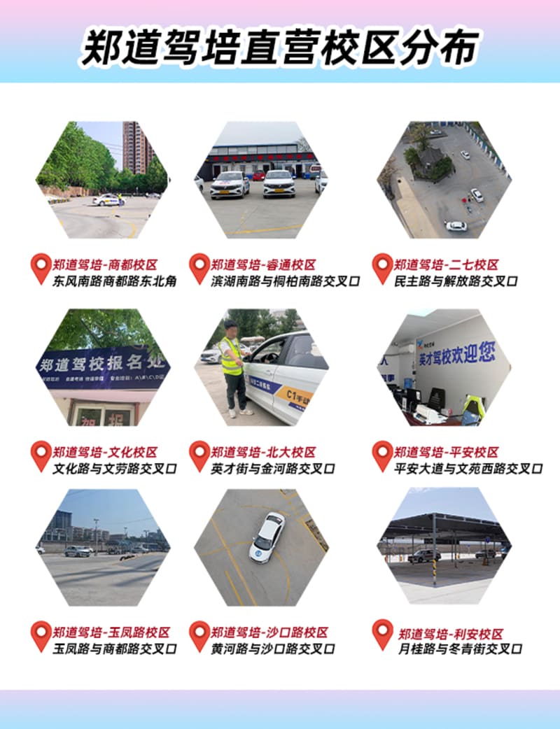 郑道驾培现已拥有九大直营校区,覆盖郑州各个区域,方便学员就近练车。为满足不同学员的学车需求,各校区均设立小型车自动挡、手动挡车型,同时还建设了标准化的训练场地,包括直线行驶、倒车入库、侧方停车、坡道定点停车和起步、曲线行驶等全方位训练区域,确保学员在真实环境中掌握驾驶技能。