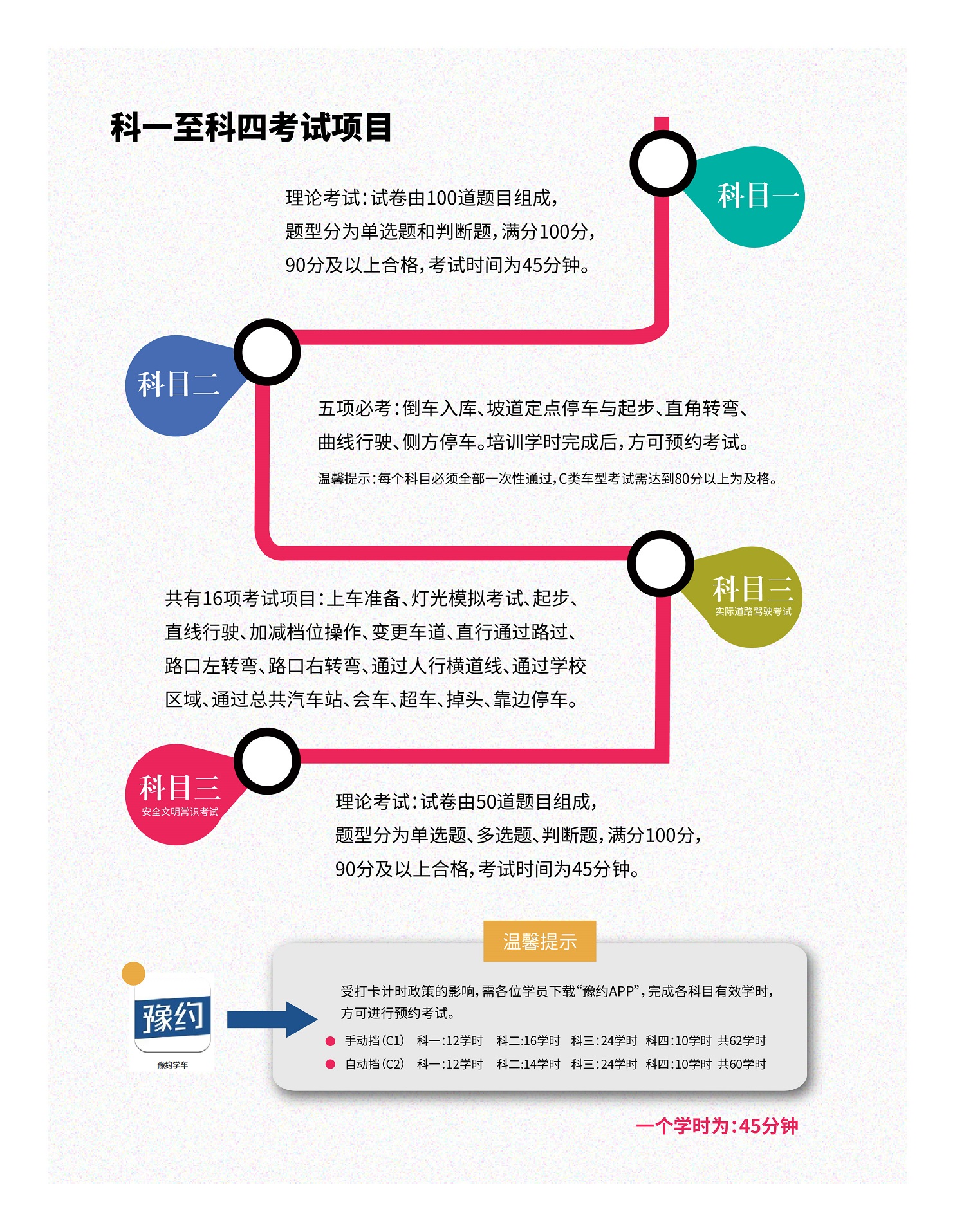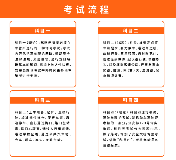 考试科目便是大家早已耳濡目染的科目一,二,三,四,依次进行,前一阶段科目考核合格方可参加下科目考试。