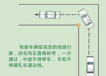 起步的时候要让车速缓慢,在开车进入直角弯之前让汽车靠右侧行驶,最好与右侧边线保持10厘米的间距。当你行驶到内直角突出点与你对齐的时候,迅速向左‘打死’方向盘。当左后轮过了突出点,驾驶人员开始逐渐向右回方向,在过程中逐渐让汽车摆正。