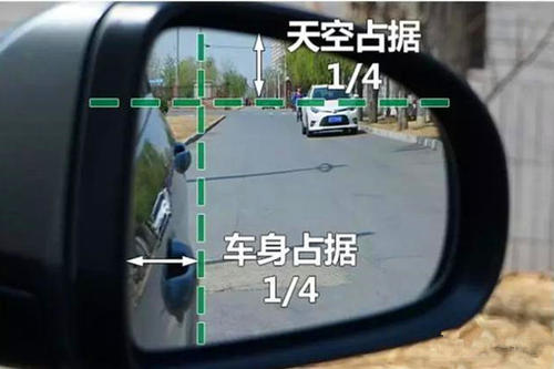 以地平线作为基准,先调整后视镜水平线,“天、地”各占1/2。再调整后视镜左右视线,出现在左侧后视镜的车身建议以1/4为宜,要能看到后门拉手。