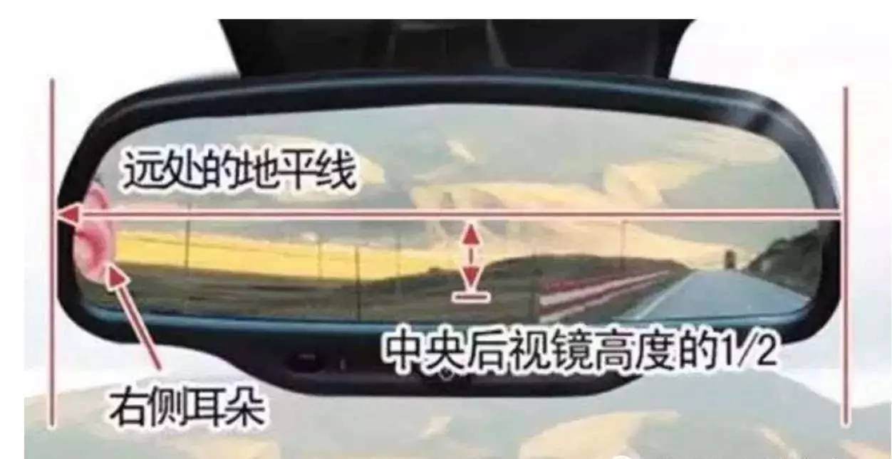 调整至能够从后视镜透过后窗,完全看清车后情况。“天、地”各占1/2就可以。注意:后挡风玻璃前不要放置太多杂物阻挡视野。