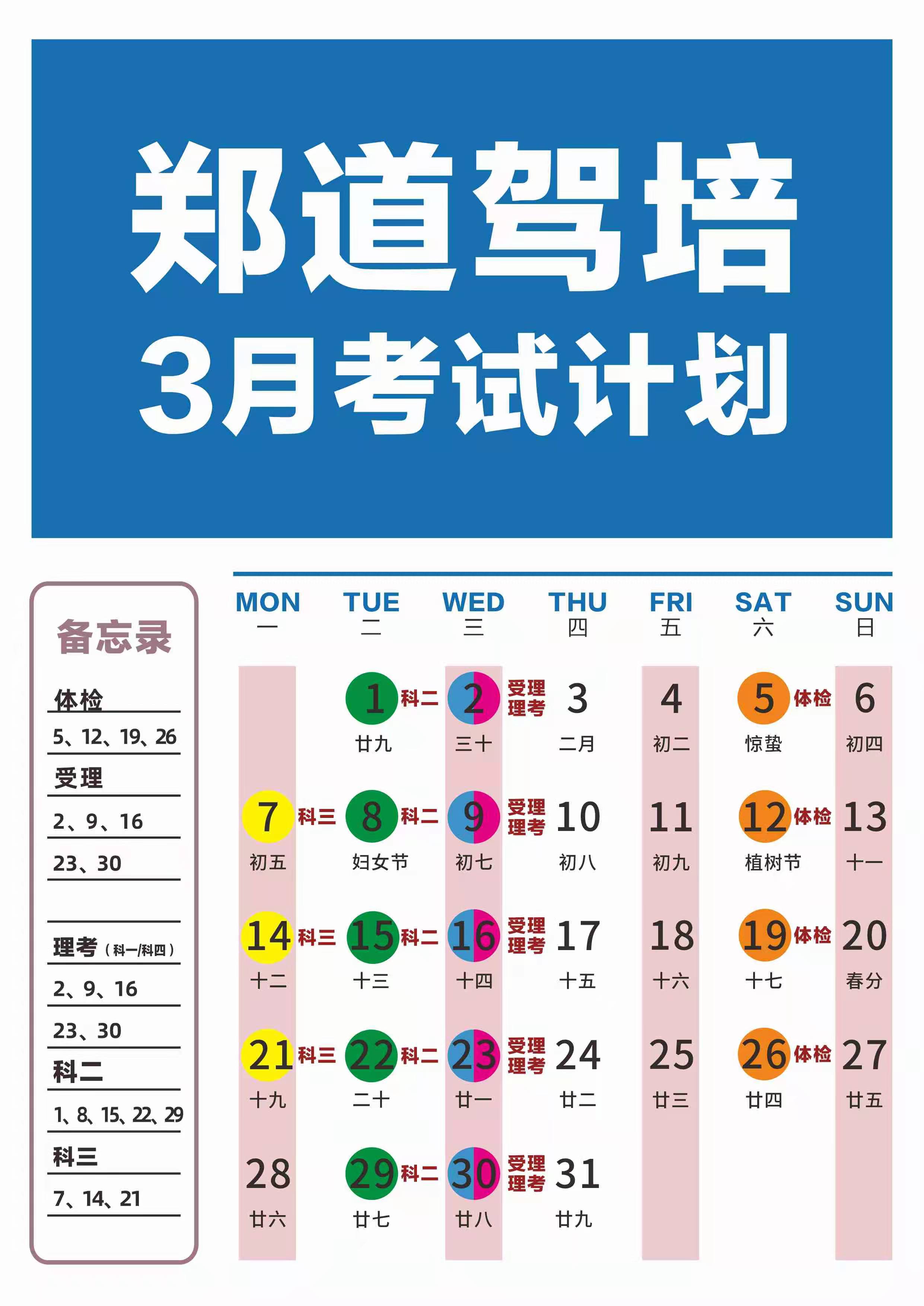 郑道驾培3月份的考试计划已经公布出来了,各位准备驾考的小伙伴们,可以提前安排好自己的空闲时间,争取快速的把驾驶证拿到手。