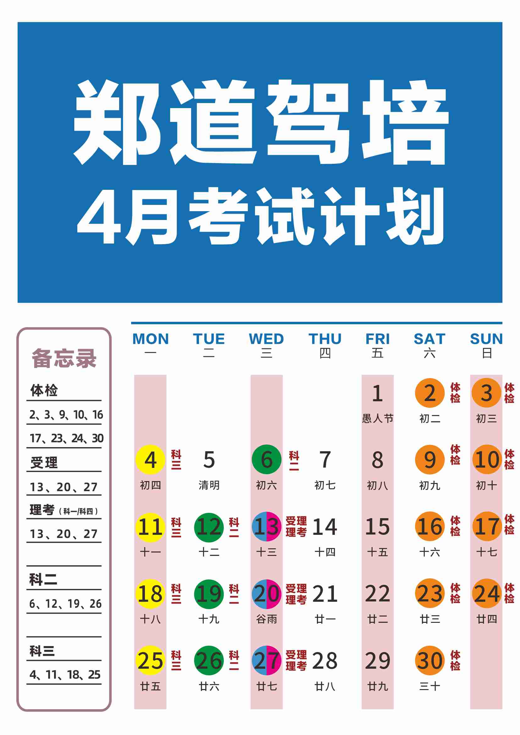 3月已过大半,已报名的小伙伴和未报名的小伙伴都来关注一下,郑道驾培4月份考期公布。