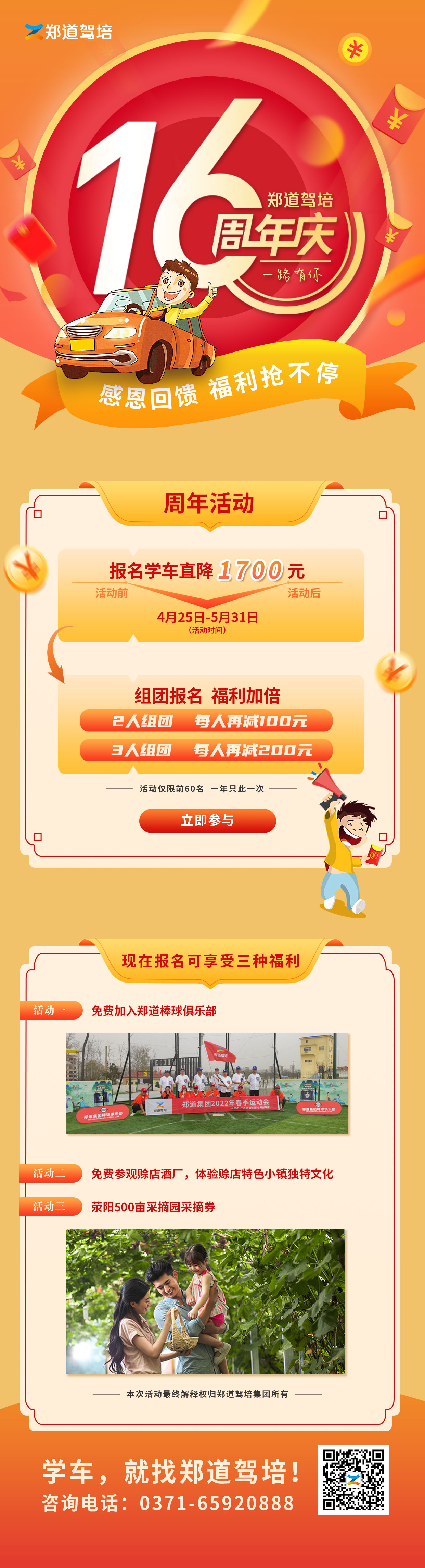 一分耕耘一分收获,郑道驾培也迎来了自己16岁的生日,即日起到5月31号,郑道驾培举行16周 年庆活动,想要报名的学员,可以提前电话咨询了。