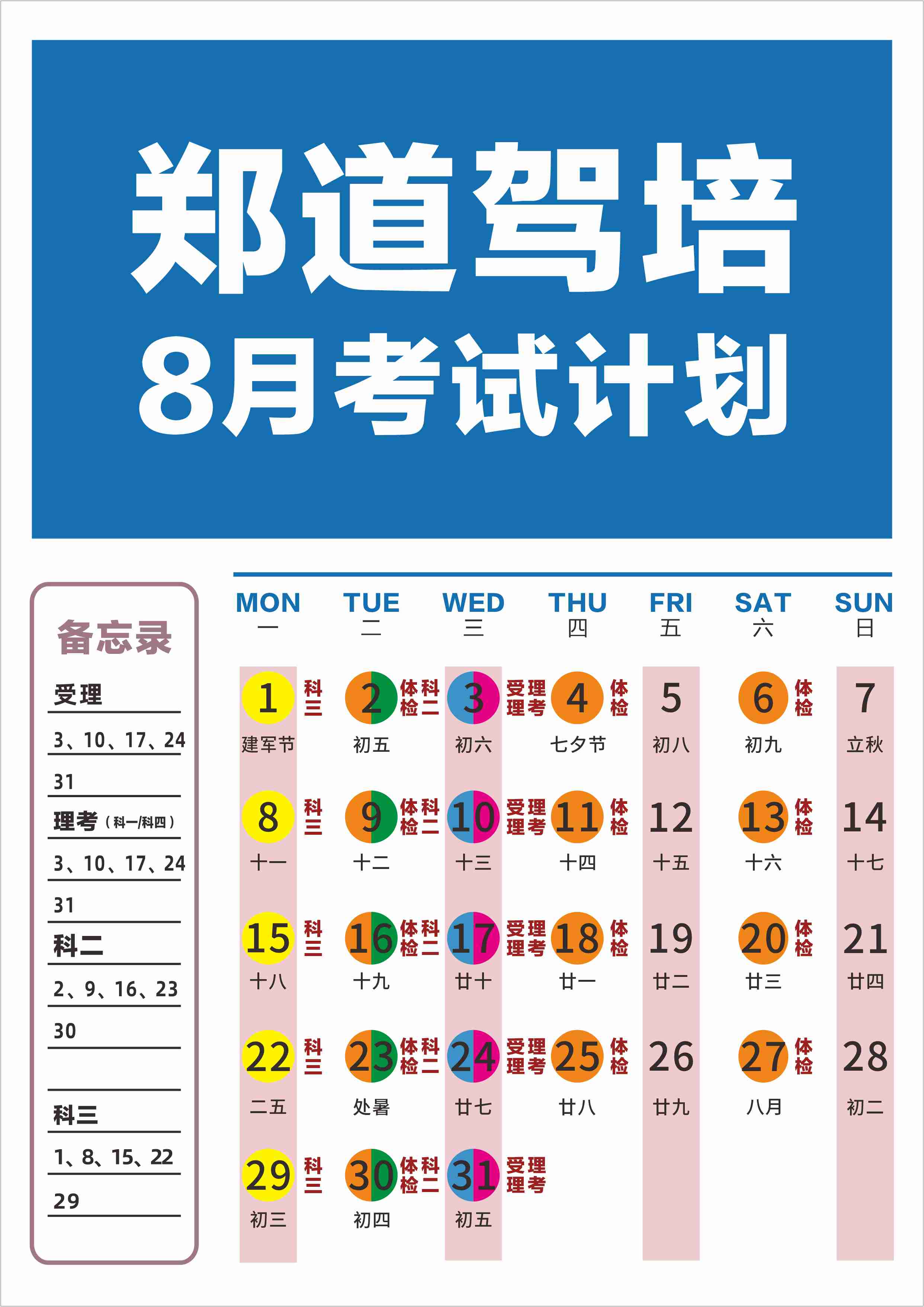郑道驾培8月份考期新鲜出炉了,近期报名,有需要参加考试的学员,可以提前安排工作了,尽量作到,工作学车两不误。