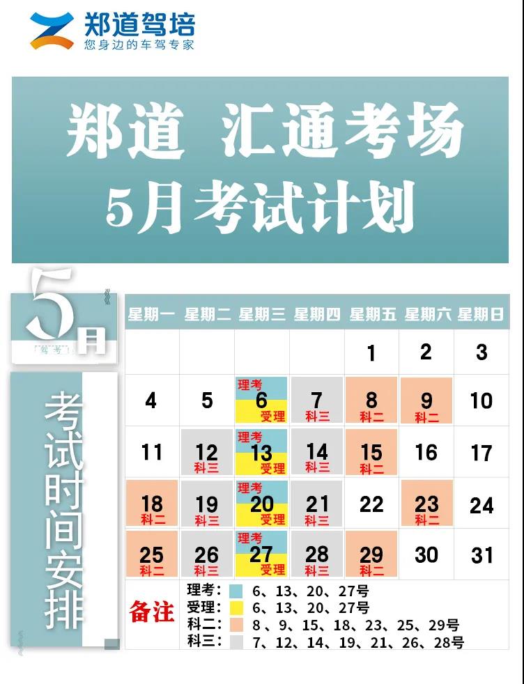 郑道汇通考场5月份驾校考试安排,可以预约考试或者是马上受理的学员们,赶紧来看看吧。